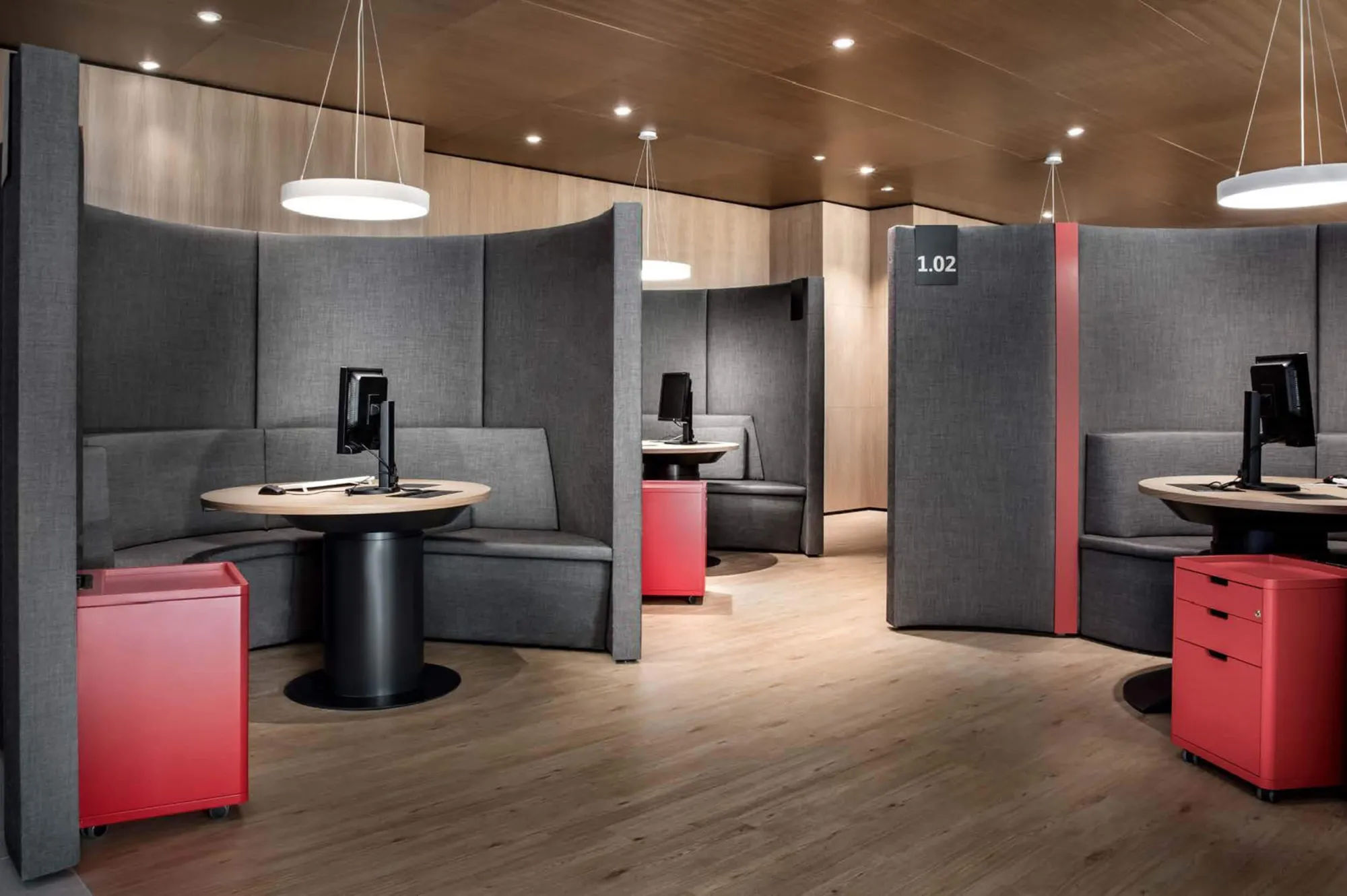 Herstellung maßgeschneiderter und personalisierter Besprechungsboxen, die ruhige und vertrauliche Gespräche innerhalb des großen öffentlichen Raums der Bank ermöglichen könnten.