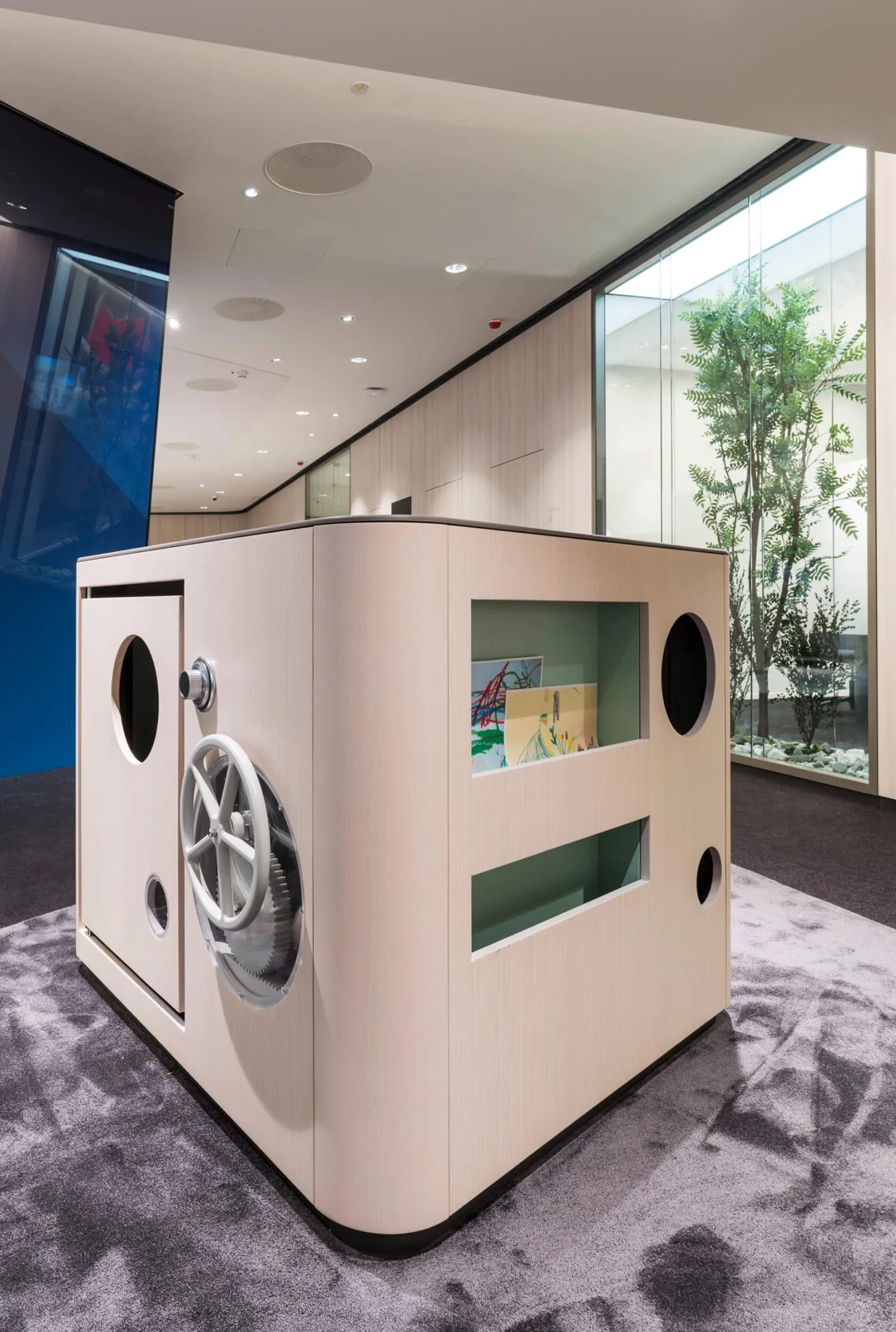 Die technischen Anforderungen zur Umsetzung reichten von lackierten, vakuumgeformten Holzelementen bis hin zu triangulierten, bedruckten Großformat-VSG-Glasscheiben.