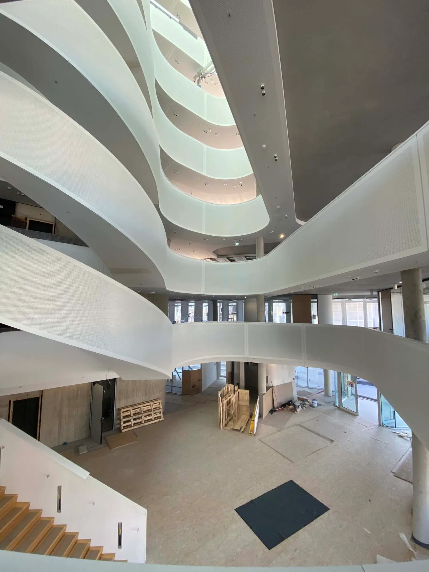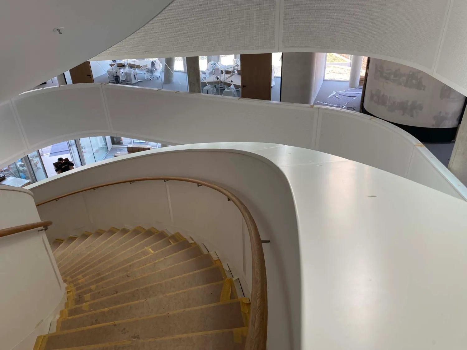 Brüstungselemente und Abdeckungen für den neuen Firmensitzes des Fassaden-Systemherstellers Schüco nach den Plänen des Architekturbüros 3XN aus Kopenhagen. Formatio fertigte die komplexen freitragenden Treppen und Atriumbrüstung. Die Herstellung basiert auf einem 3D Scan des gesamten Gebäudes, um ein genaues 3D-Modell zu erstellen. Die Produktion nutzte individuell programmierte Software Lösungen und neueste 5-Achs-CNC-Technologie, um die geschwungenen Linien der Architektenpläne und der gebauten Realität präzise umzusetzen.