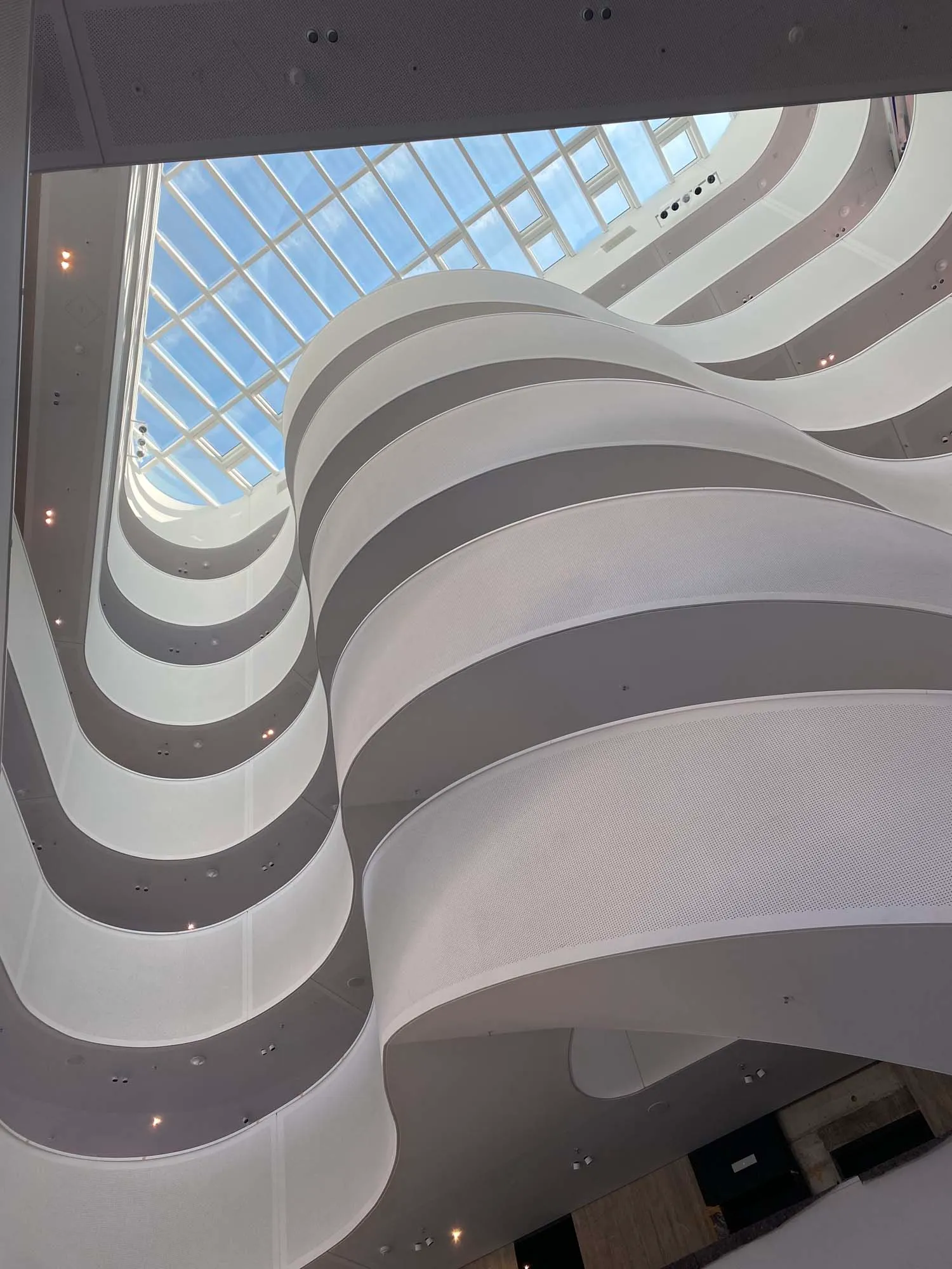 Beim Besuch des fertiggestellten Gebäudes heute, steht die schwebende Form der freitragenden Treppe als Symbol für Innovation im gesamten Innenraum.