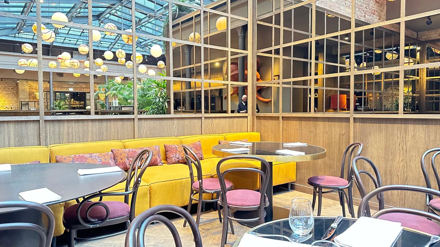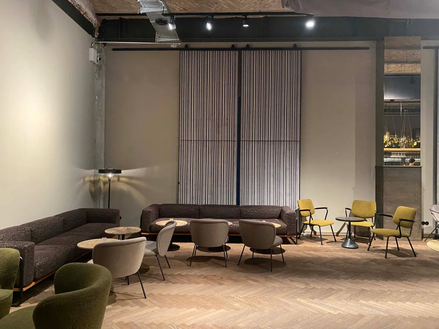 Die Lobby, Bar und das Restaurant dienen als dynamische Räume, in denen eine eklektische Mischung von Materialien zum Leben erweckt wird. Die markante Wandverkleidung ist aus Polstergurten handgewebt, beleuchtet von farbigen Glasröhren und ergänzt durch eine reiche Auswahl an Textilien und gebeiztem Holz.