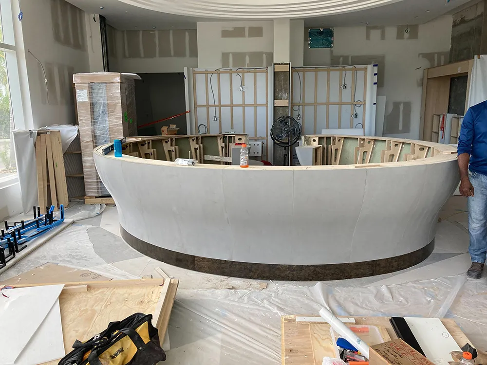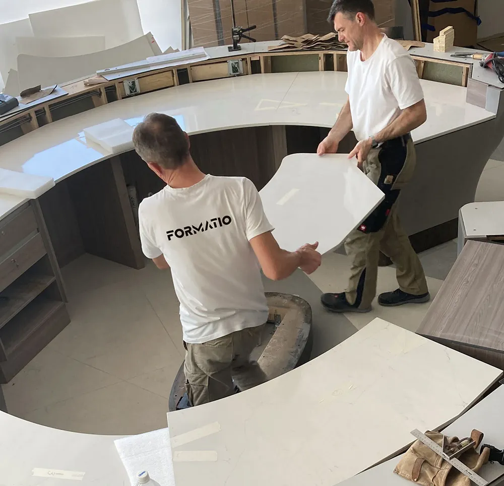 Im Mittelpunkt des Designs steht ein Empfangstresen, ein innovatives Element, das von Formatio sorgfältig in 3D aus Mineralwerkstoff gefertigt wurde, um einen optisch beeindruckenden Blickfang zu schaffen, der die Aufmerksamkeit des Betrachters auf sich zieht. Sehen Sie unten die einzelnen Schritte der Entstehung dieser Theke, vom CAD-Entwurf bis zur endgültigen Installation.