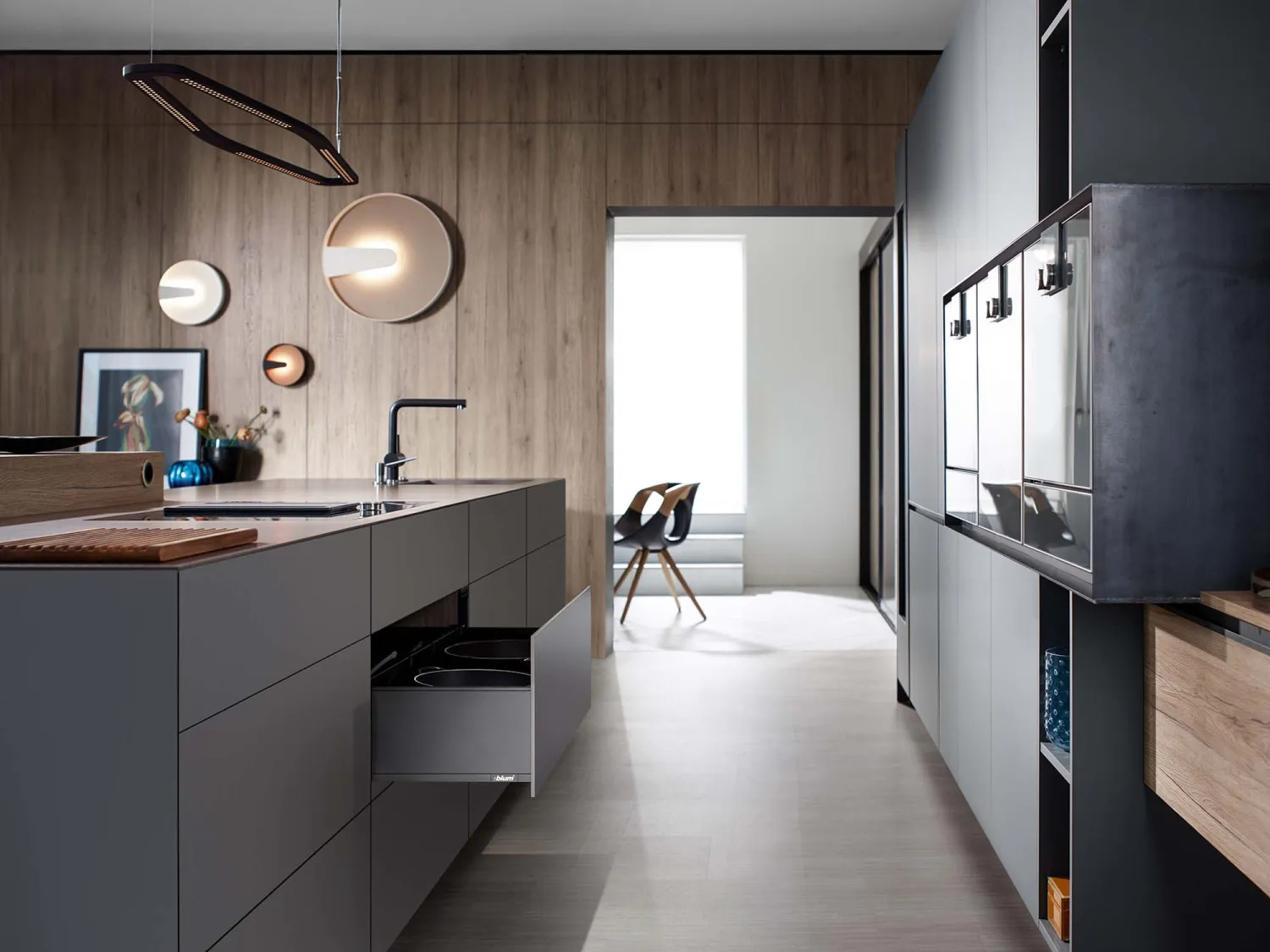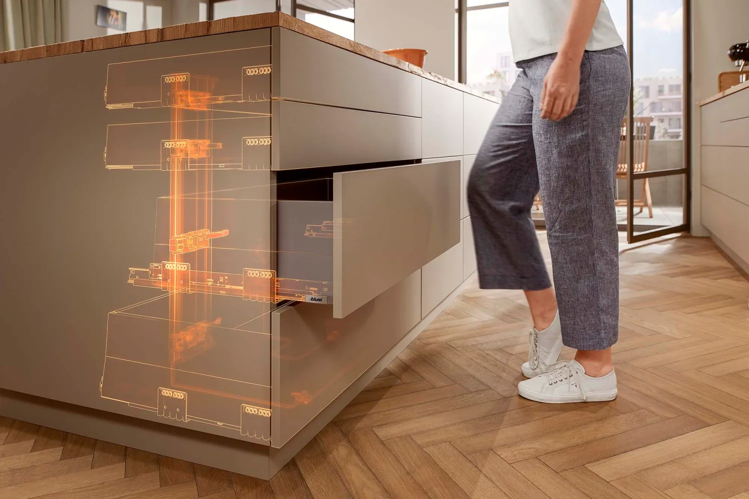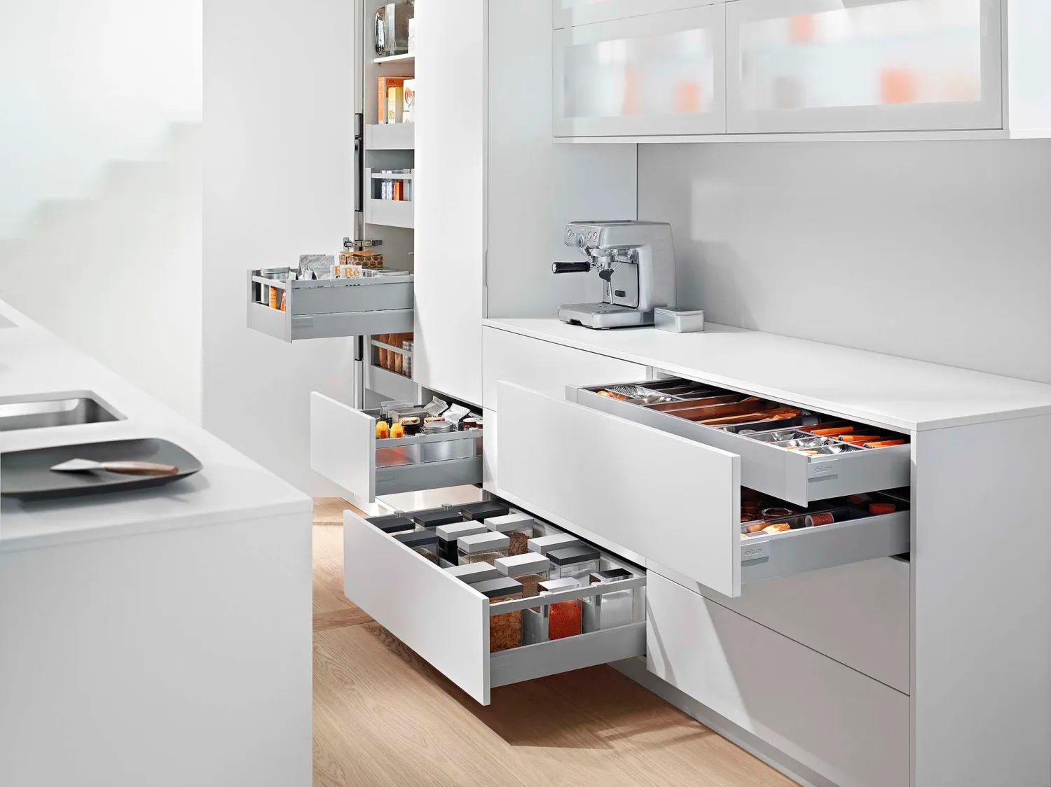 Wir verwenden nur die qualitativ hochwertigsten Scharniere und Küchenbeschläge. Wir haben den Zugang zu jeder Art von Scharnier, von den Standardscharnieren für Schranktüren mit sanfter Schließung über Eck- und Auszugslösungen bis hin zu den immer beliebteren "Blum REVEGO"-Scharnieren für Taschentüren.