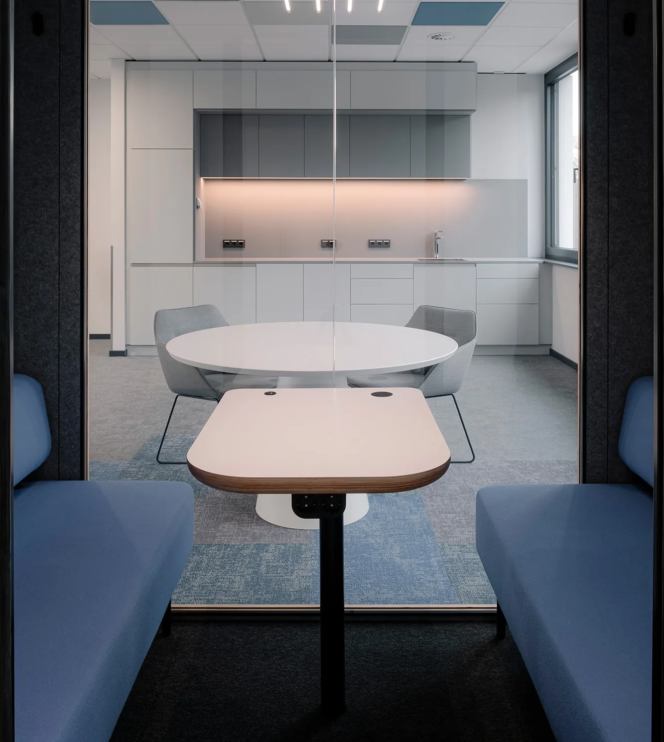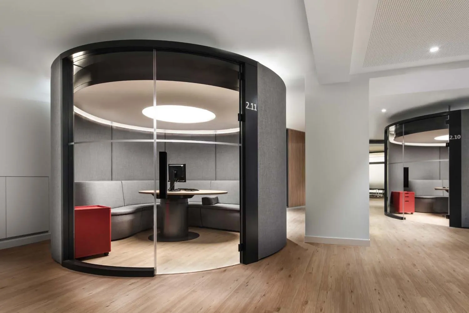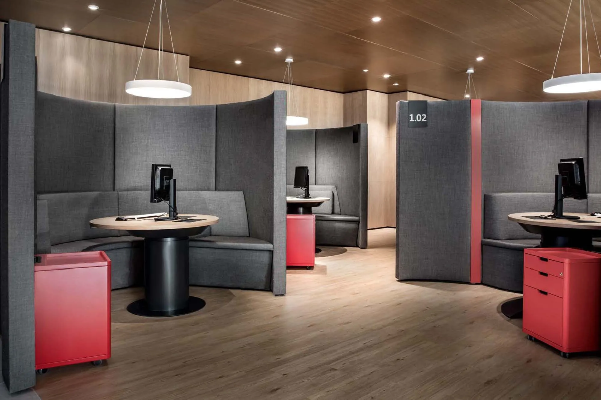 Bau von maßgeschneiderten und personalisierten Besprechungsräumen, die ruhige und vertrauliche Besprechungen innerhalb des öffentlichen Bankraums ermöglichen können.