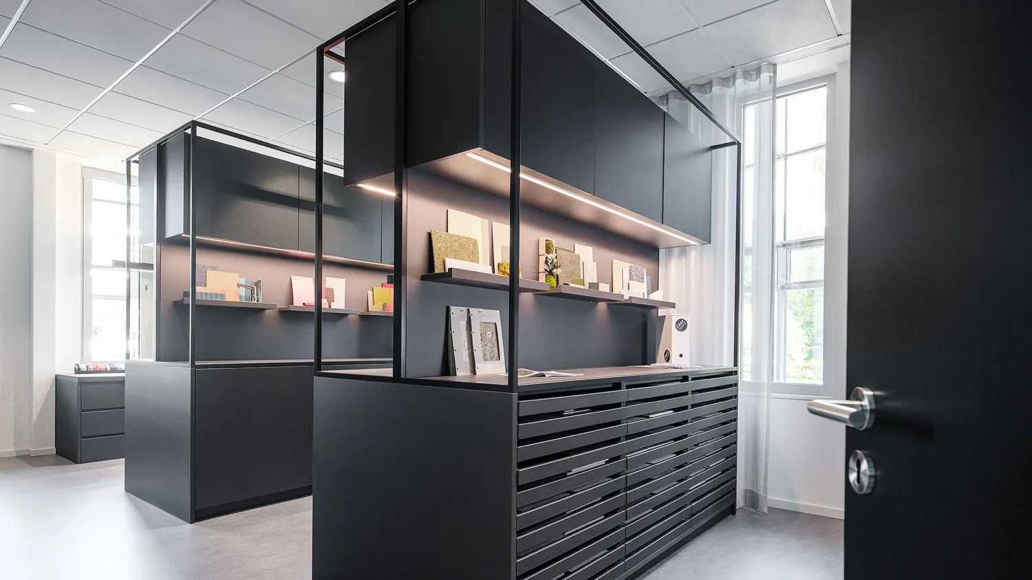 Darüber hinaus haben wir eine Reihe innovativer Aufbewahrungslösungen entwickelt, wie z. B. große, tiefe Schubladenbänke, die sich ideal für die Aufbewahrung von Produktmustern oder Katalogen eignen.