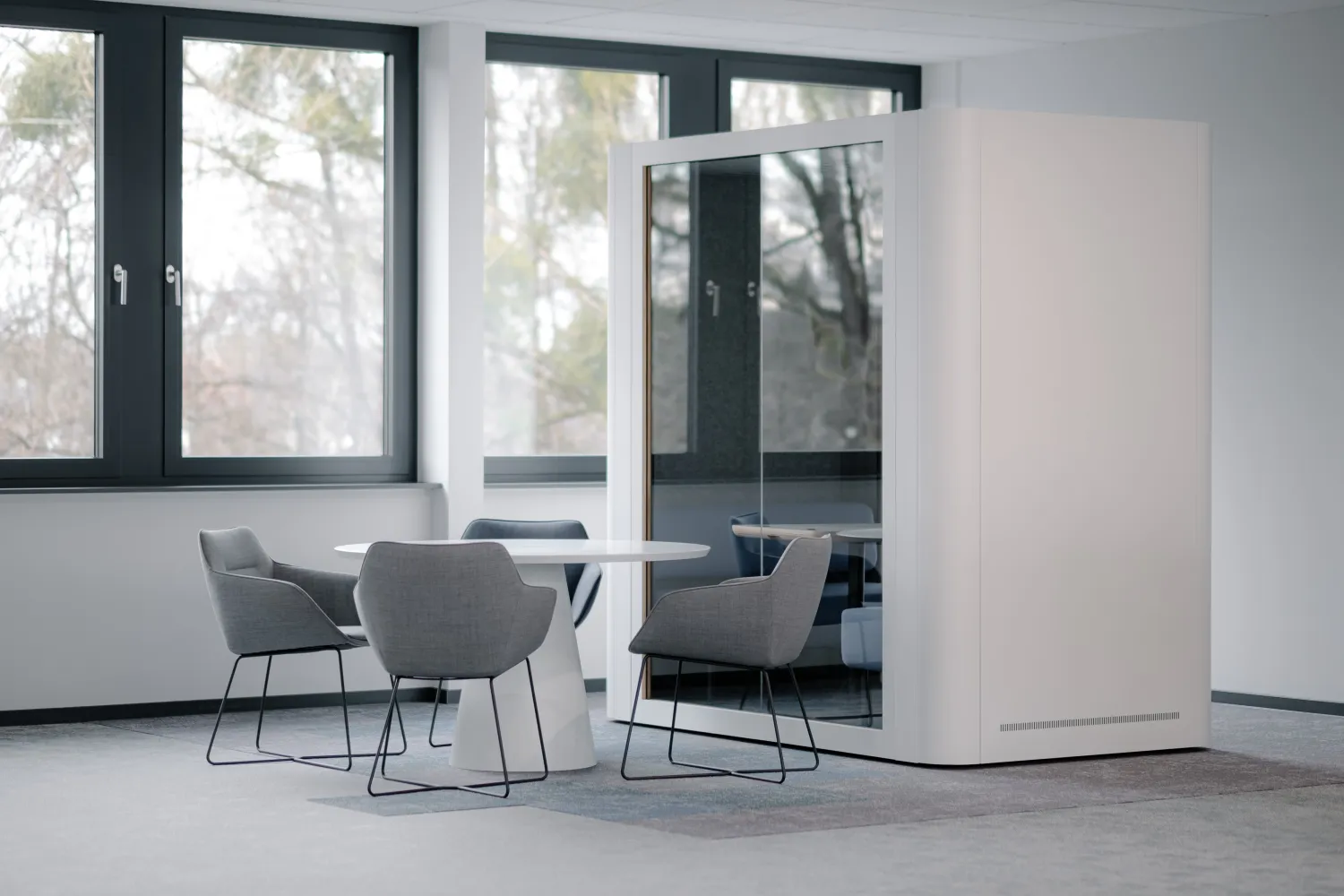 Empfangsbereich und RezeptionOffice Meeting Pods setzen neue Maßstäbe für die Zusammenarbeit und bieten eine vielseitige und anpassungsfähige Lösung für moderne Arbeitsplätze. Diese modernen, in sich geschlossenen Einheiten bieten ein Gleichgewicht zwischen Privatsphäre und Kommunikationsmöglichkeiten und schaffen so ein ideales Umfeld für Teambesprechungen oder konzentriertes Arbeiten des Einzelnen. Mit fortschrittlicher Technologieintegration, akustischem Design und anpassbarer Ästhetik verbessern die Meeting Pods die Dynamik am Arbeitsplatz. Sie dienen als dynamische Ergänzung zu Großraumbüros und fördern die Zusammenarbeit und Kommunikation in einer angenehmen Atmosphäre. In einer Welt, in der Flexibilität und effiziente Raumnutzung an erster Stelle stehen, erweisen sich Meeting Pods als äußerst nützliche Elemente zur Gestaltung einer produktiven und anpassungsfähigen Arbeitsumgebung.